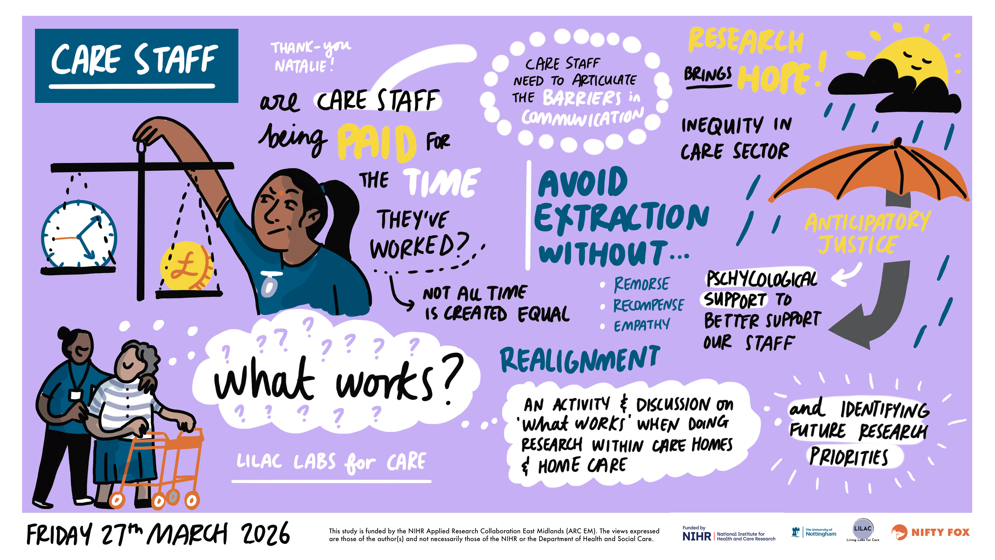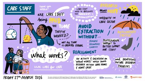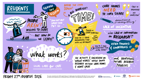 The live scribed images, created by Nifty Fox, capture the discussions that took place at the end of project event, bringing together academic researchers, care home staff and managers to reflect on what works when conducting research in care settings.